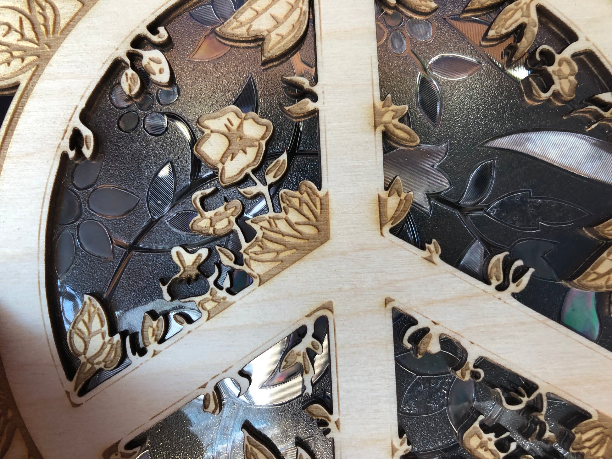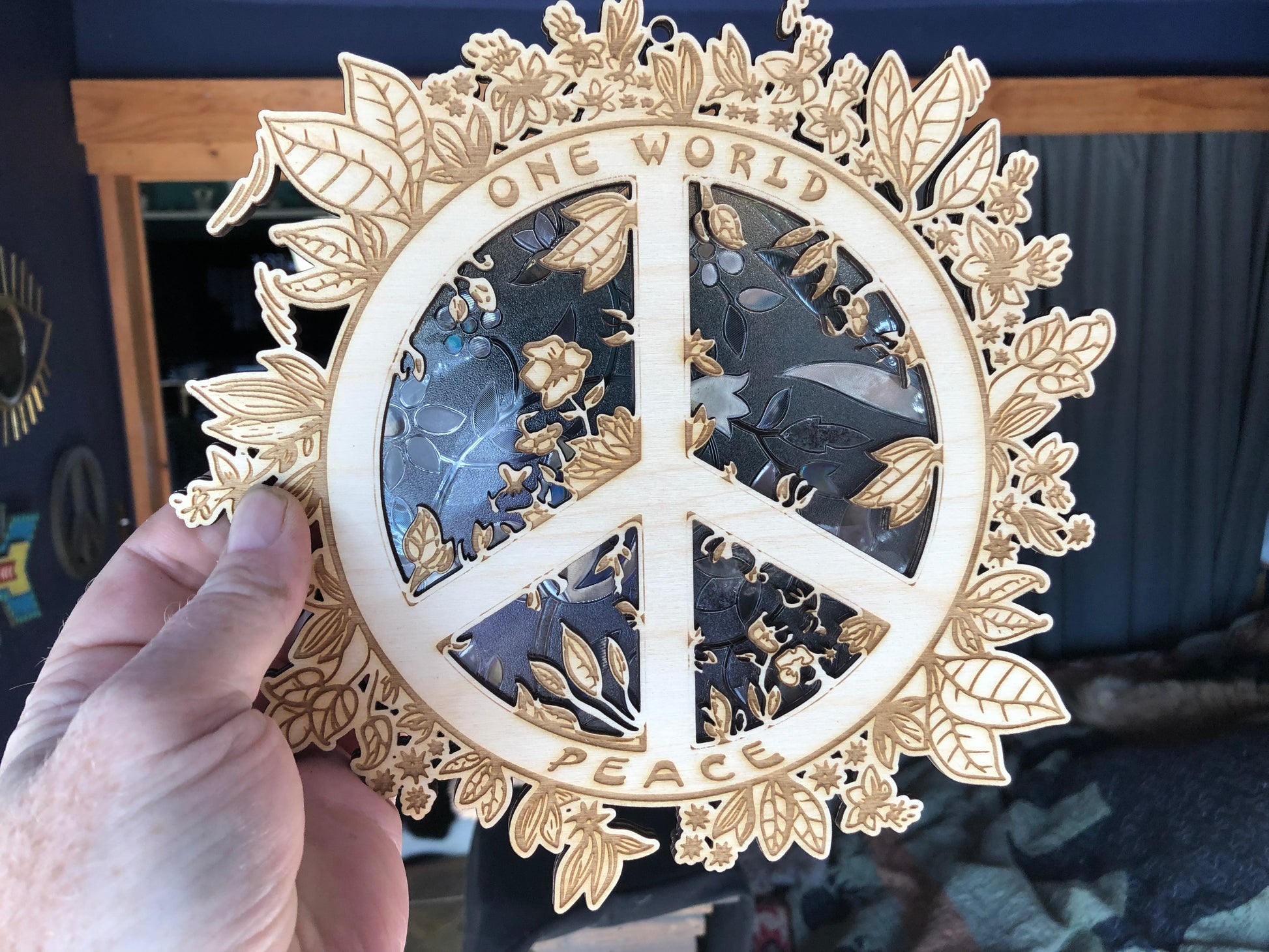 This item is a light catcher that features a peace sign made of Birch wood and faux stained glass insert. It is designed to hang from a window or a wall and reflect the sunlight in different colors. The peace sign symbolizes harmony, tranquility, and hope for a better world. This item is handmade by Magic Dragon Creations, a small business that specializes in unique and whimsical crafts. This item is a perfect gift for anyone who loves peace and beauty.