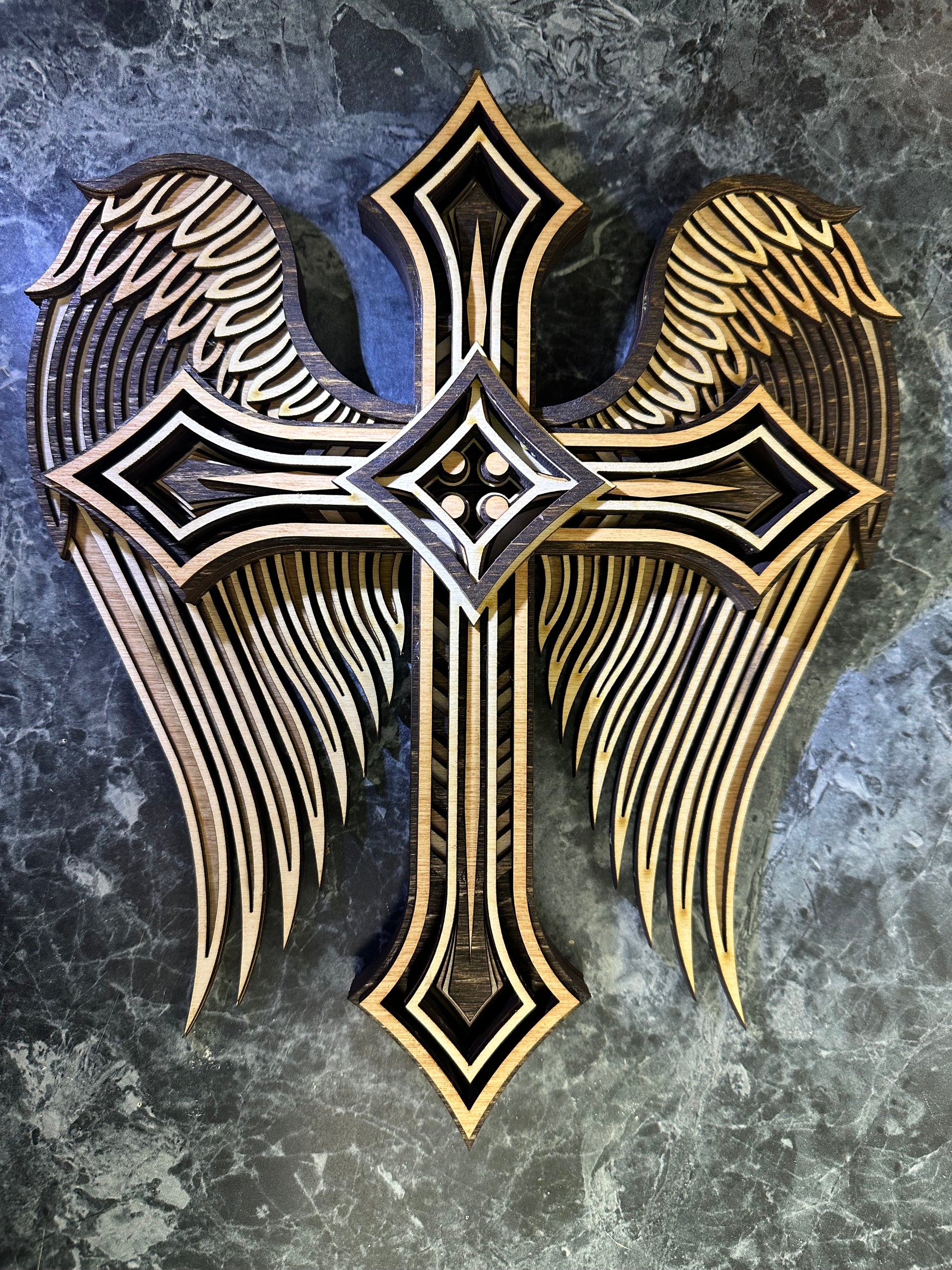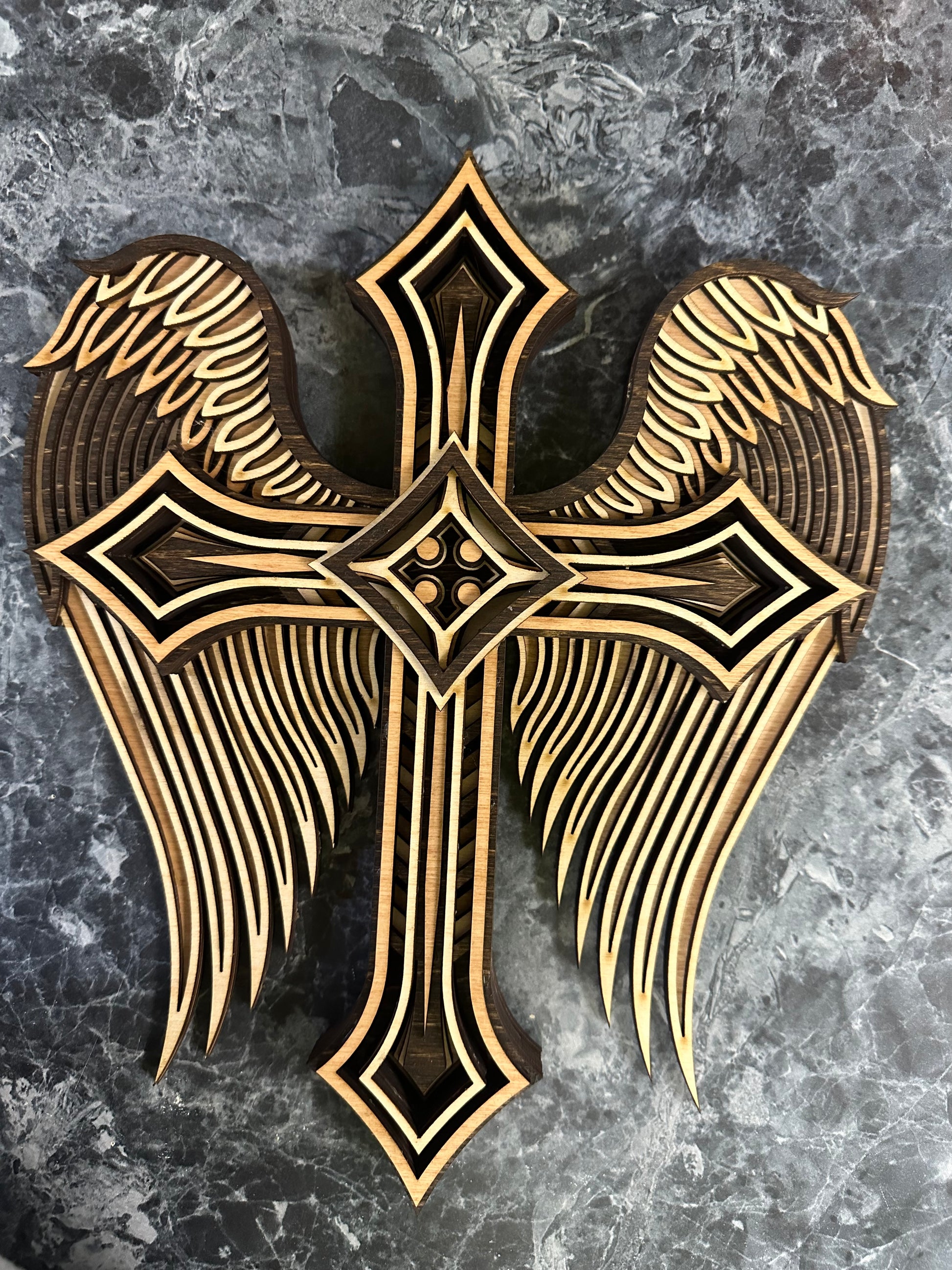 This item is a wall art winged cross 3D 9-layer, which is a stunning piece of art that features a cross with wings. The cross is made of nine layers of Baltic Birch wood and is a perfect gift for anyone who loves religious or spiritual art, or who appreciates the craftsmanship and beauty of woodwork. The item measures approx. 10" x 8" x 1.5".